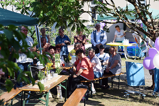 Wir begannen mit einer Festandacht in der Georgenkirche, bei der sich die Bewohner*innen mit in die Fürbitte einbringen konnten. Danach gingen wir mit unseren Gästen gemeinsam in die Wohnstätte. DJ Gerd empfing uns schon mit Musik. Bei Kaffee und Gebäck erzählte unser Wohnstättenleiter Herr Fuchs kurzweilig über die Geschichte der Wohnstätte. Frau Oestreich und Frau Reichard wohnen bereits seit 20 Jahren in der Wohnstätte und erhielten als »echte Jubilare« ein kleines Geschenk. Danach gab es viele nette Grußworte und Geschenke, für die wir uns hier noch einmal herzlich bedanken möchten. Besonderer Dank gilt Frau Müller und Herrn Schmetzke für die musikalische Begleitung der Andacht sowie Frau Lehmann, die an der Bar aushalf und viel zu tun hatte. Es gab Zeit und Gelegenheit für Wiedersehensfreude, für viele Gespräche und Lachen über alte Begebenheiten. Das Wetter war so toll wie die Stimmung, das gute Essen und Trinken und die tolle Musik zur Untermalung trugen zu diesem schönen entspannten Fest bei und machten, besonders für unsere Bewohner*innen, diesen Tag zu einem unvergesslichen Erlebnis. – Und eigentlich freuen wir uns jetzt schon darauf, in spätestens fünf Jahren wieder so schön zu feiern.