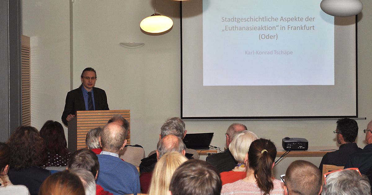 Etwa 60 Interessierte besuchten am 28. Februar den Vortrag „Euthanasie in Frankfurt (Oder)“ im Wichernsaal der Wichern Diakonie. Es sprach Dr. Konrad Tschäpe vom kulturwissenschaftlichen Institut der Europauniversität Viadrina, der auch für die Gedenkstätte „Opfer politischer Gewaltherrschaft“ tätig ist.