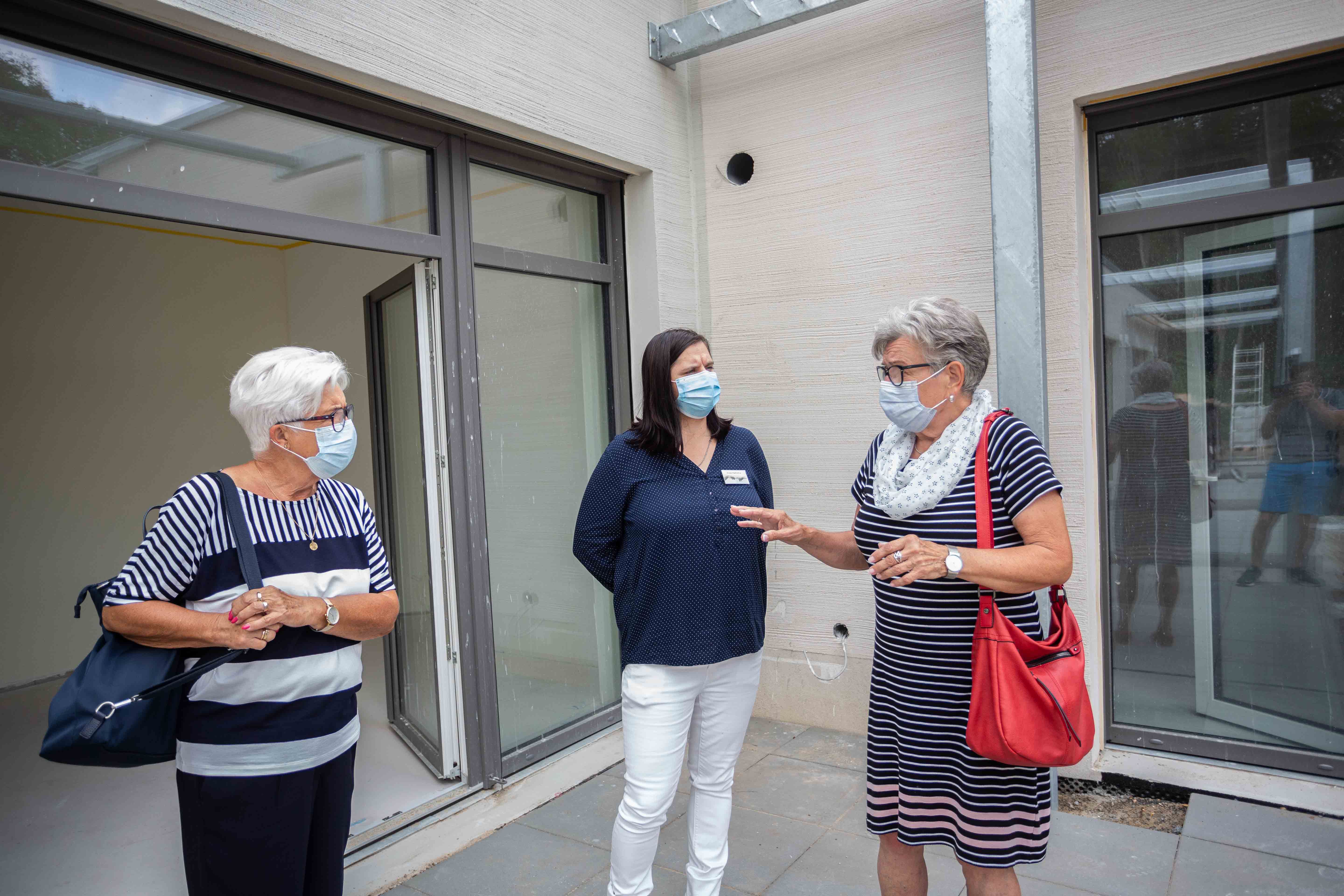 Liebevoll von den Mitarbeiterinnen vorbereitet, nutzten zahlreiche Interessierte die Möglichkeit, sich durch den schon fast fertigen Bau führen zu lassen. Lichtdurchflutete, großzügige Räume für die zukünftigen Gäste des Hospizes, breite Flure und viel Platz auch für die Mitarbeiterinnen und Mitarbeiter, etwa im Besprechungsraum, so zeigte sich der Neubau. In Kleingruppen, etwa einer Familie oder mit zwei bis drei Personen, wurden die Interessierten durch das Haus geführt und auf vielerlei Besonderheiten hingewiesen. So hat jedes Zimmer eine eigene Terrasse und auf dem Dach werden Solarmodule installiert. Auch ein Raum der Stille zur inneren Einkehr wird es geben. Die Frankfurterinnen Christina Brilke und Martina Albrecht haben ebenfalls die Möglichkeit genutzt, sich den Bau mit Mitarbeiterin Katharina Mildes anzusehen. "Wir sind begeistert", sagen die beiden Frauen. „Es ist hell, luftig, mitten in der Stadt und doch etwas abseits gelegen“, zeigt sich Martina Albrecht vom neuen Haus und dem Standort in der Bergstraße begeistert. Im direkten Vergleich mit dem derzeitigen Hospiz in der Kantstraße, das Martina Albrecht ebenfalls kennt, ist besonders die Barrierefreiheit ein Gewinn. Außerdem ist es insgesamt eine sehr großzügige Anlage in der Bergstraße, findet sie. Die bisher dreizehn Plätze für Menschen, die eine stationäre Pflege und Betreuung benötigen, werden weiterhin zur Verfügung stehen. Auch der Name Regine Hildebrandt wird mit umziehen.