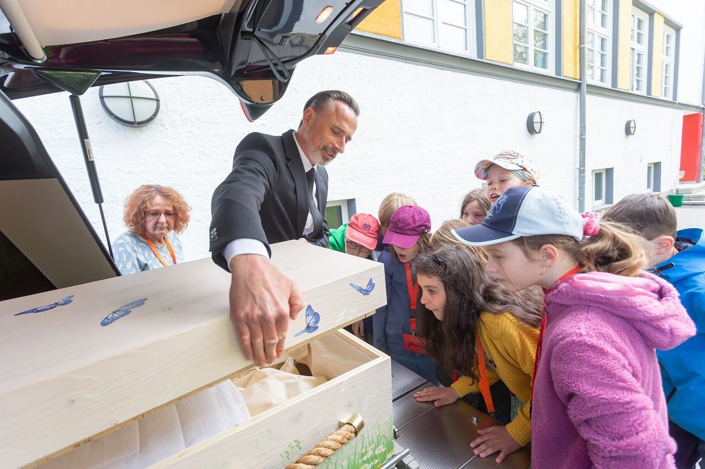 „Bist du auch manchmal traurig bei einer Beerdigung“, will ein anderes Kind wissen. „Wir können mit der Traurigkeit der Menschen sehr gut umgehen und manchmal, ja, da bin ich auch traurig“, erklärt er seine Gefühle bei der Arbeit. Ein Mädchen hat gehört, das Verstorbene verbrannt werden und will wissen, ob das stimmt. David Rost erklärt mit freundlicher Stimme, dass Feuerbestattungen in neun von zehn Sterbefällen gewünscht werden und die Asche in der Urne dann auf dem Friedhof beigesetzt wird. Der Besuch des Bestatters ist eines der Programmpunkte, der für die Kinder am spannendsten ist, sagt Sandra Sippmann als Koordinatorin des Projektes Hospiz macht Schule. Vor 14 Jahren ist das Projekt, das sich mit dem Tod und dem Sterben beschäftigt, vom ehrenamtlichen Hospizdienst der Wichern Diakonie für dritte Klassen gestartet worden. „Jedes Kind hat schon einmal einen Verlust erlebt, entweder von Verwandten oder auch von lieb gewonnen Haustieren. Wir wollen den Kindern Fragen beantworten und Ängste nehmen“, erklärt Sandra Sippmann. Wenn in einer Elternversammlung, die vorbereitend für die besondere Schulwoche in der Regel stattfindet, den Eltern die Ängste vor dem Projekt genommen werden konnten, gibt es danach immer sehr positive Rückmeldungen der Familien über das Projekt Hospiz macht Schule. Es ist ein Gewinn für die ganze Familie. Jetzt nach zwei Jahren Corona Pause, kann es nun endlich weitergehen. Insgesamt geht das Projekt in jeder dritten Klasse der evangelischen Grundschule über fünf Tage. Dabei werden ganz verschiedene Themen behandelt. So sollen die Kinder Krankheiten pantomimisch darstellen oder sie malen Bilder über ihre Vorstellungen, was nach dem Tod kommt. „Einige sehen sich dabei auf einem Regenbogen oder schauen von einer Wolke herunter“, so Sandra Sippmann. Seit über 10 Jahren ist Gabriele Zaumseil als ehrenamtliche Mitarbeiterin des Hospizdienstes dabei und freut sich ebenfalls über den Neustart. „Die Unbefangenheit der Kinder hat sich in den letzten Jahren nicht geändert“, so ihre Erfahrung. Das zeigt sich auch, als die Kinder den Bestattungswagen per Handy rufen dürfen. Mit einem Kichern erklärt Carla, wo der Wagen hinkommen soll. Vor der Schule nimmt sich David Rost viel Zeit, das Fahrzeug zu erklären. Dann darf auch der Laderaum mit einem Sarg darin von den Kindern geöffnet werden. Der Bestatter demonstriert die verschiedenen Funktionen und die Kinder können auch mal die Rollos an den großen Seitenfenstern, im Fachjargon Schabracken genannt, hoch und wieder runterfahren. Das alles passiert sehr würdevoll. Als er den Kindern erlaubt, auch einen Blick in den Sarg zu werfen und ihn einige Zentimeter öffnet, gibt es große Augen. „Da liegt eine Rose drin“, bemerken einige Kinder aufmerksam. Für Bestatter David Rost ist dieses Projekt ein ganz besonderes und deswegen macht er auch weiterhin mit. „Ich denke, langfristig kann sich dadurch sogar die Bestattungskultur ein wenig ändern“, schaut er voraus. „Die Kinder wissen nach dieser Woche oftmals mehr über das Sterben und den Ablauf einer Bestattung als die Eltern. Etwa wie sich Hinterbliebene selbst in eine Trauerfeier einbringen können“. Wir wollen in jedem Fall in den nächsten Jahren das Projekt weiter anbieten, da wir erleben, wie wichtig es ist mit Kindern über die schweren Themen um Krankheit – Sterben – Tod und Trauer zu sprechen.“ Sagt Sandra Sippmann vom ehrenamtlichen Hospizdienst.