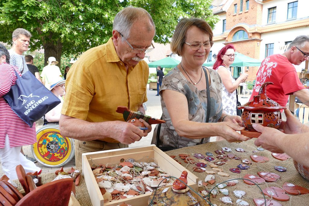 Besonders im Mittelpunkt des Interesses sind freilich die Holz-, Keramik- oder Produkte aus Stoff der Gronenfelder Werkstätten, die sich wieder riesiger Beliebtheit erfreuten. Auch der 120. Geburtstag der Wichern Diakonie wurde zusammen mit den Gästen und einer riesigen Torte gefeiert, die vom Geschäftsführer der Gonenfelder Werkstätten Frank Hoffmann angeschnitten wurde. Das Backwerk von unserem langjährigen Partner der Bäckerei Jannusch ging weg wie die sprichwörtlichen warmen Semmeln, wenngleich an diesem Tag wegen der Temperaturen eher eine Abkühlung nötig gewesen wäre. Viele neugierige Blicke gab es auch auf die neue Scheune, die auf dem Gelände gebaut und die bald fertiggestellt wird. Besonders der neue Bioladen interessierte viele Besucher. Dort sollen noch im Juli die ersten Kunden begrüßt werden. Viele Frankfurter nutzten den Tag in Gronenfelde trotz viele anderer Angebote in der Stadt, um sich zu treffen und auch um die kulinarischen Köstlichkeiten vom Landgut zu probieren. Insgesamt zog Frank Hoffmann ein sehr positives Fazit. „Wir sind wirklich mehr als zufrieden und danken den Frankfurtern für Ihre Treue“, erklärt er. „Insgesamt haben wir über 4000 Besucher gezählt, was besonders ein Kompliment für die Arbeit unserer Beschäftigten ist“. Auch den vielen Helfern, die den Topfmarkt überhaupt erst möglich machen, gebührt ein großer Dank.