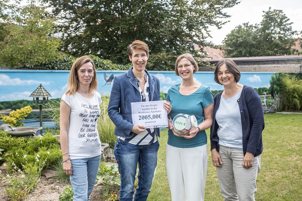 Die beiden Apothekerinnen Beate Mika (2.v.r.) und Annegret Krösing (2.v.l.) sind zwei der langjährigsten regelmäßigen Spenderinnen für das Hospiz „Regine-Hildebrandt-Haus“ in der Bergstraße. Seit gut zwei Jahrzehnten unterstützen sie die Arbeit im Hospiz und auch in den letzten 12 Monaten hatten die beiden Geschäftsinhaberinnen wieder eine Spendenbox in ihren Apotheken aufgestellt.