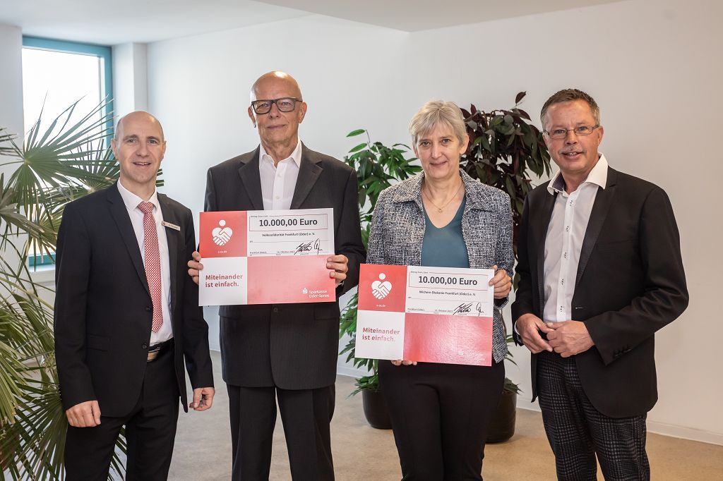 BU: Gil Pönitzsch von der Sparkasse Oder Spree übergibt jeweils 10.000 Euro an Joachim Krauß vom Vorstand der Volkssolidarität und Gabriele Floßmann von der Wichern Diakonie. Dezernent Jens Marcel Ullrich sichert von der Stadt auch weiterhin Unterstützung zu.