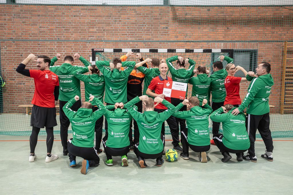 Der Direktor für Privat- und Gewerbekunden der Sparkasse Gil Pönitzsch lobte die Sportler für ihren Einsatzwillen und freute sich, dass die Sparkasse so eine tolle Mannschaft unterstützen kann, wie er sagte. Mittlerweile ist das Fußball-Hallenturnier der Gronenfelder Kicker im Februar in der Landesliga des Behinderten- und Rehabilitationssportverband Brandenburg e. V. in Frankfurt zu einer Tradition geworden und auch bei der 15. Auflage, diesmal in der Sporthalle Sabinussstraße, sind weitere acht Mannschaften aus ganz Brandenburg angetreten. Die Vorfreude auf die Spiele war groß, denn das letzte Landesligaturnier im November hatten die Gronenfelder Kicker noch gewonnen und wollten dies natürlich wiederholen. Richtig rund lief es für die Mannschaft der Gronenfelder Werkstätten der Wichern Diakonie allerdings nicht. Zum Schluss des Tages stand der 5. Platz auf der Anzeigentafel. Der Sieger kam diesmal aus Cottbus.