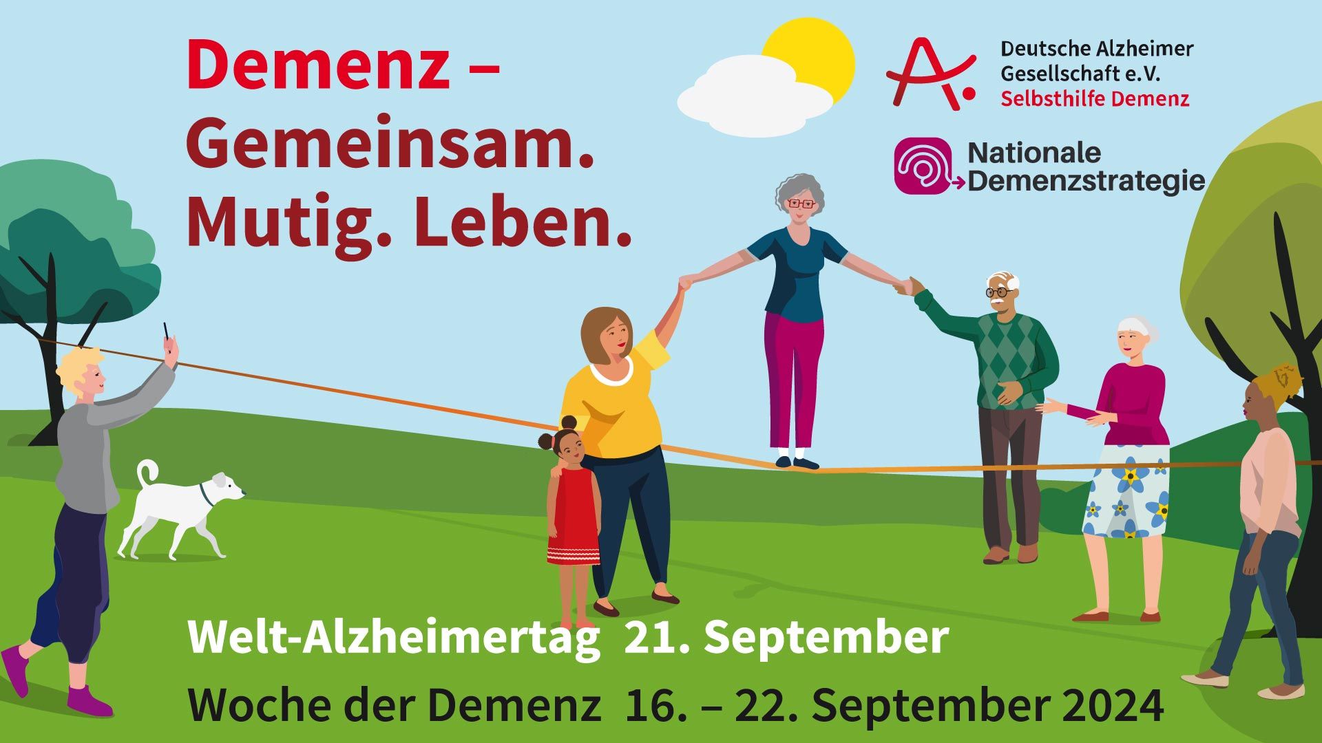 Der Welt-Alzheimertag 2024 trägt das Motto „Demenz - Gemeinsam. Mutig. Leben.“ und soll uns daran erinnern, dass es notwendig ist, diesen Herausforderungen gemeinsam zu begegnen – sei es als Familie, im Freundeskreis oder als Gesellschaft. Menschen mit Demenz sowie ihre Angehörigen stehen tagtäglich vor Veränderungen und finden Wege, um mit den damit verbundenen Einschränkungen umzugehen. Sie geben nicht auf und teilen ihre Erfahrungen zunehmend auch im öffentlichen Raum. (Quelle: Deutsche Alzheimer Gesellschaft e. V.: Welt-Alzheimertag (deutsche-alzheimer.de)
